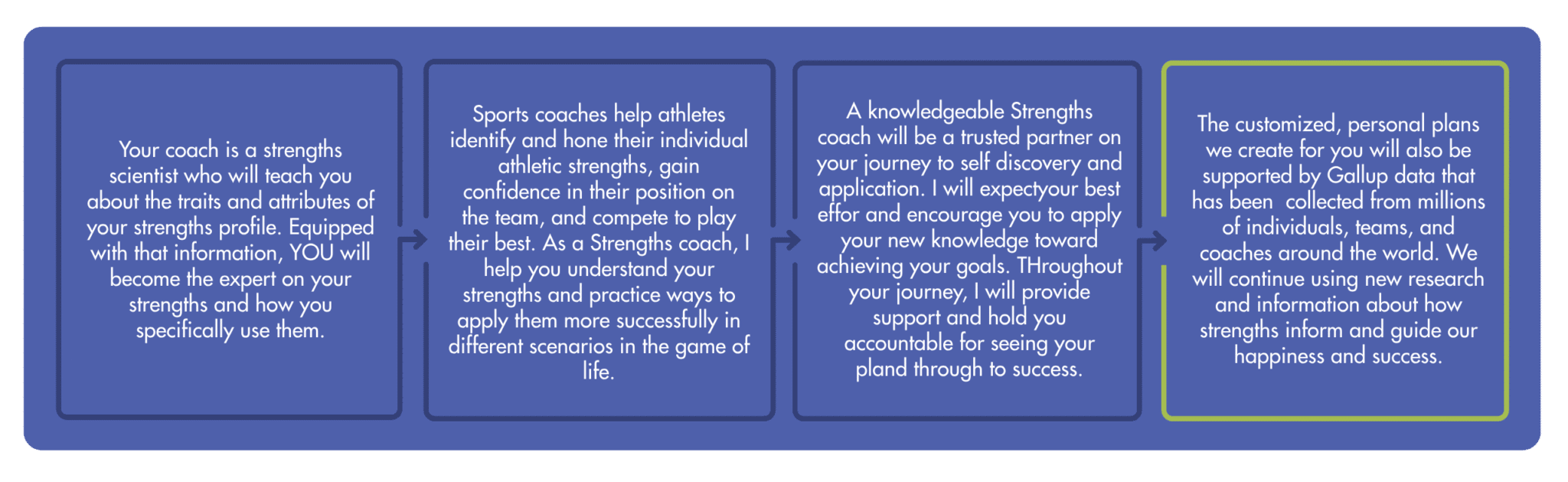 When you start your Strengths coaching journey, you’ll take three big steps to success:
